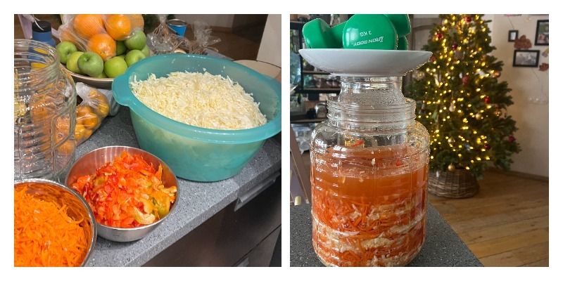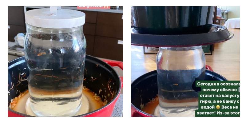 Na fotce jsou moje úplně první stavby na kvašení zelí. Vlevo: Smaltovaný litinový kastrol + sklenice vody (3 kg) stojící na talíři. Na šťavnaté zelí (nebo dobře prolisované) to stačí. Vpravo: stejný design, ale s výztuhou. Na vrchu nádoby je další litinová pánev.