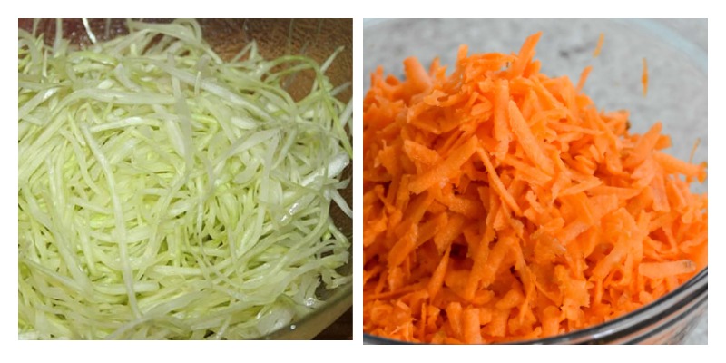 - Smíchejte vše najednou: zelí, mrkev, pepř, sůl a koření. Ale já to nedělám.
